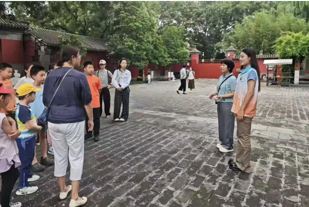 志愿者服务时段精准覆盖博物馆客流高峰,展厅日常运维与秩序维护高效发力。每日到岗后,志愿者检查展品陈列状态,测试多媒体互动设备的运行情况,轻声提醒游客注意保持安全距离、禁用闪光灯拍摄,维护良好的参观秩序。除此之外,同学们还围绕场馆优化服务设计了游客反馈问卷,精准收集意见,并协助博物馆老师开展6-13岁儿童系列课程活动。通过非遗体验、书法与诗词创作等活动,让孩子感受传统文化魅力。